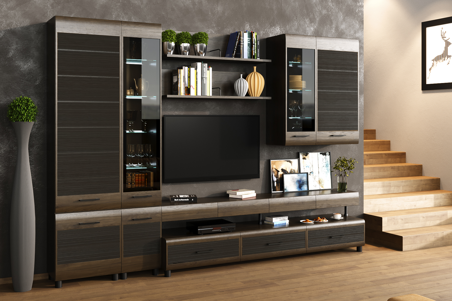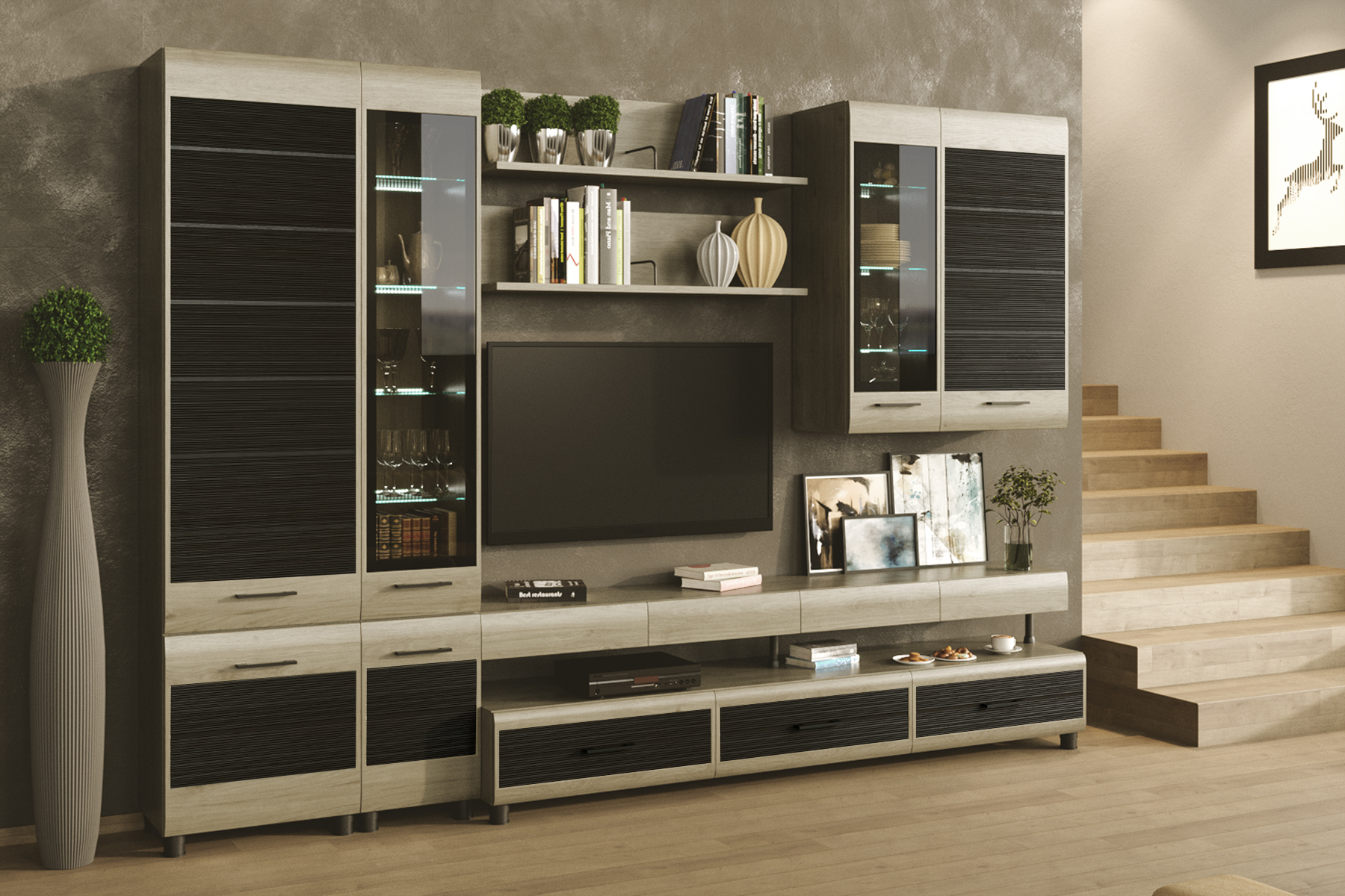 Корпусная мебель для гостиной "Камелия" - это модульная мебель. Фасады с комбинированными вставками имитируют специальную технологию "браширования". Мебель изготавливается из высококачественных материалов: ЛДСП, МДФ (фасад), стекло фасадов с оттенком "графит".