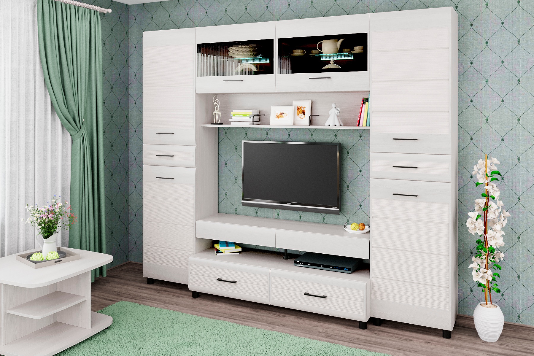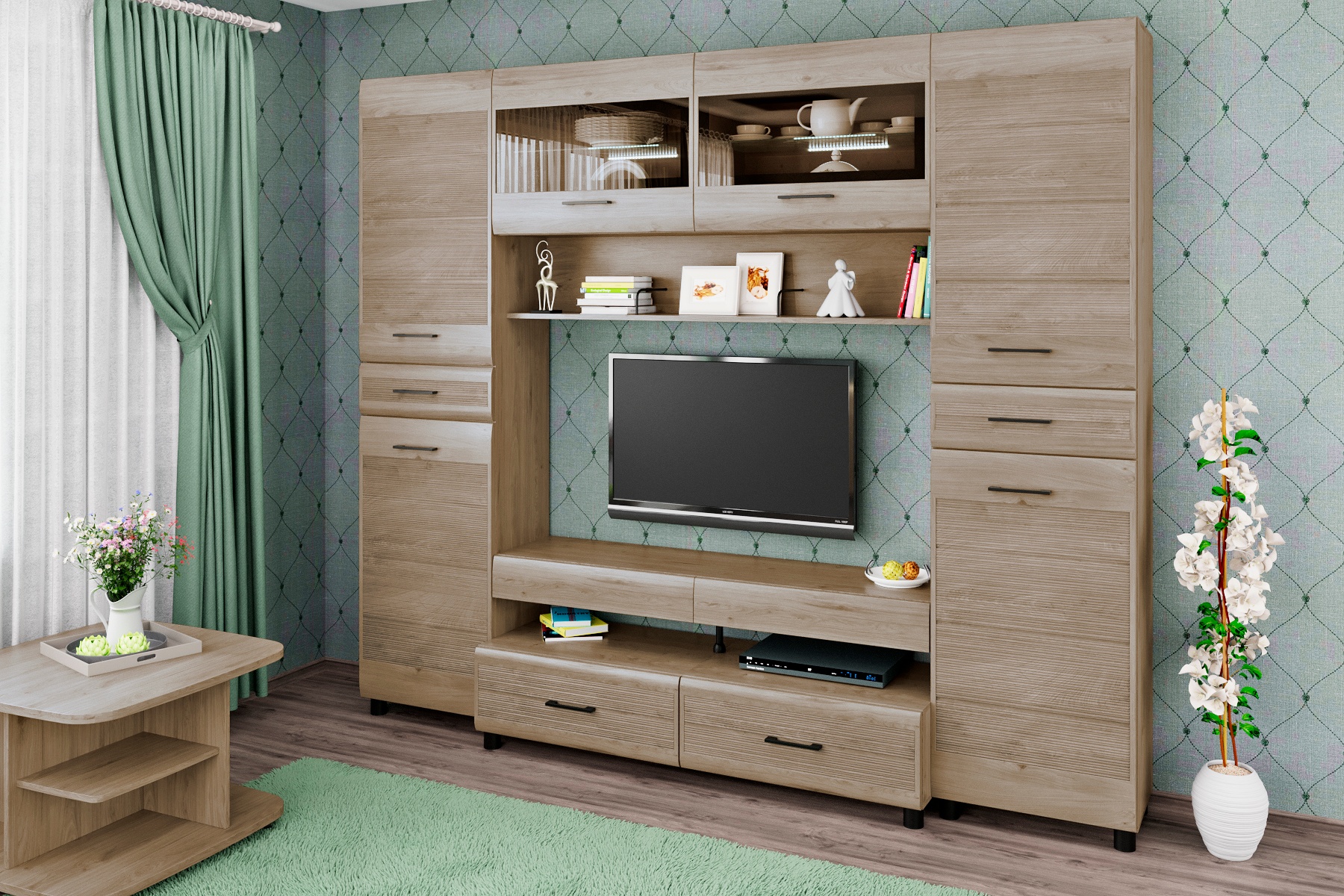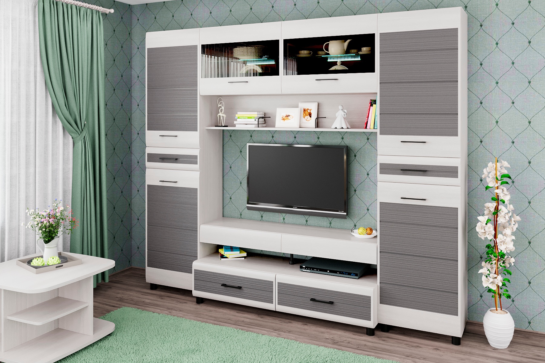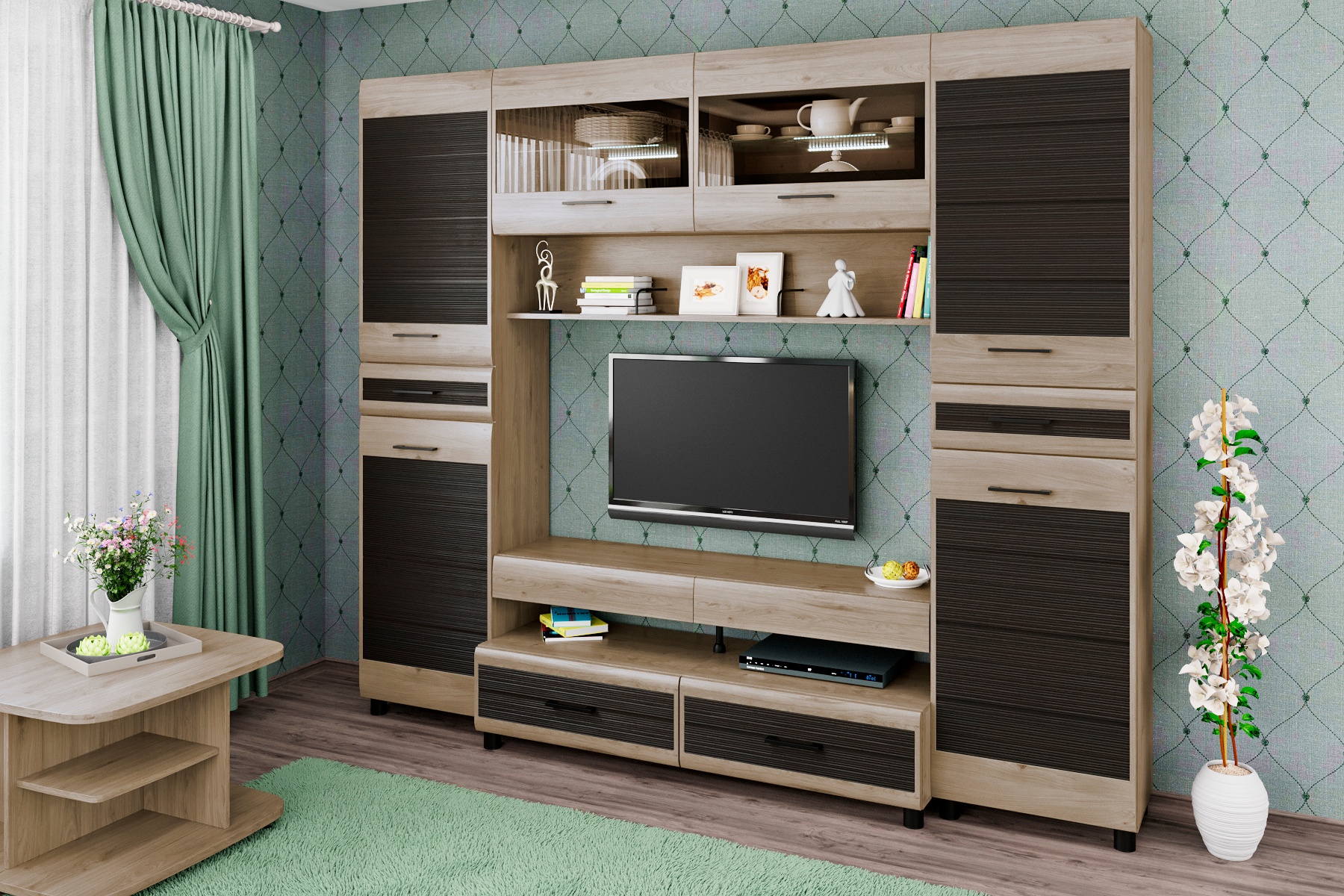 Корпусная мебель для гостиной "Камелия" - это модульная мебель. Фасады с комбинированными вставками имитируют специальную технологию "браширования". Мебель изготавливается из высококачественных материалов: ЛДСП, МДФ (фасад), стекло фасадов с оттенком "графит".