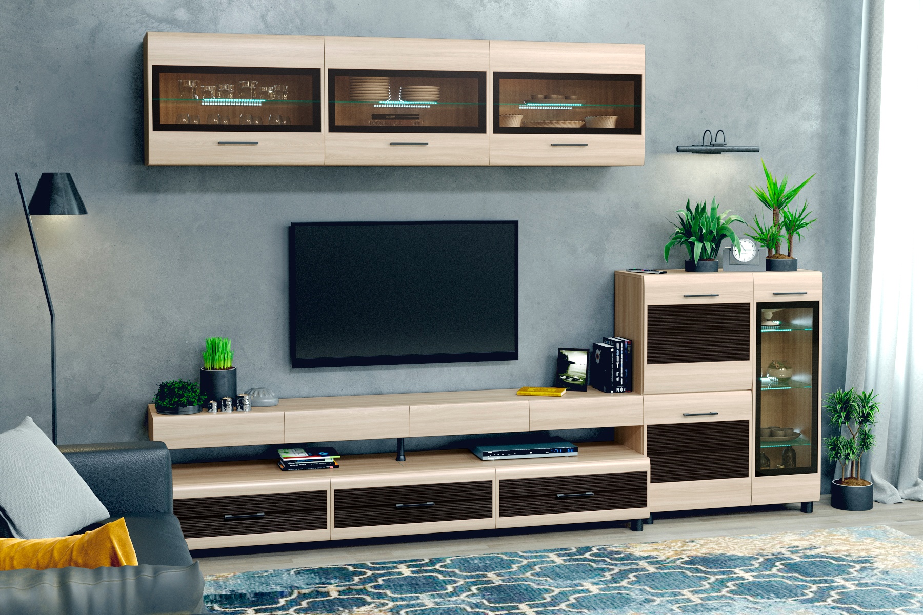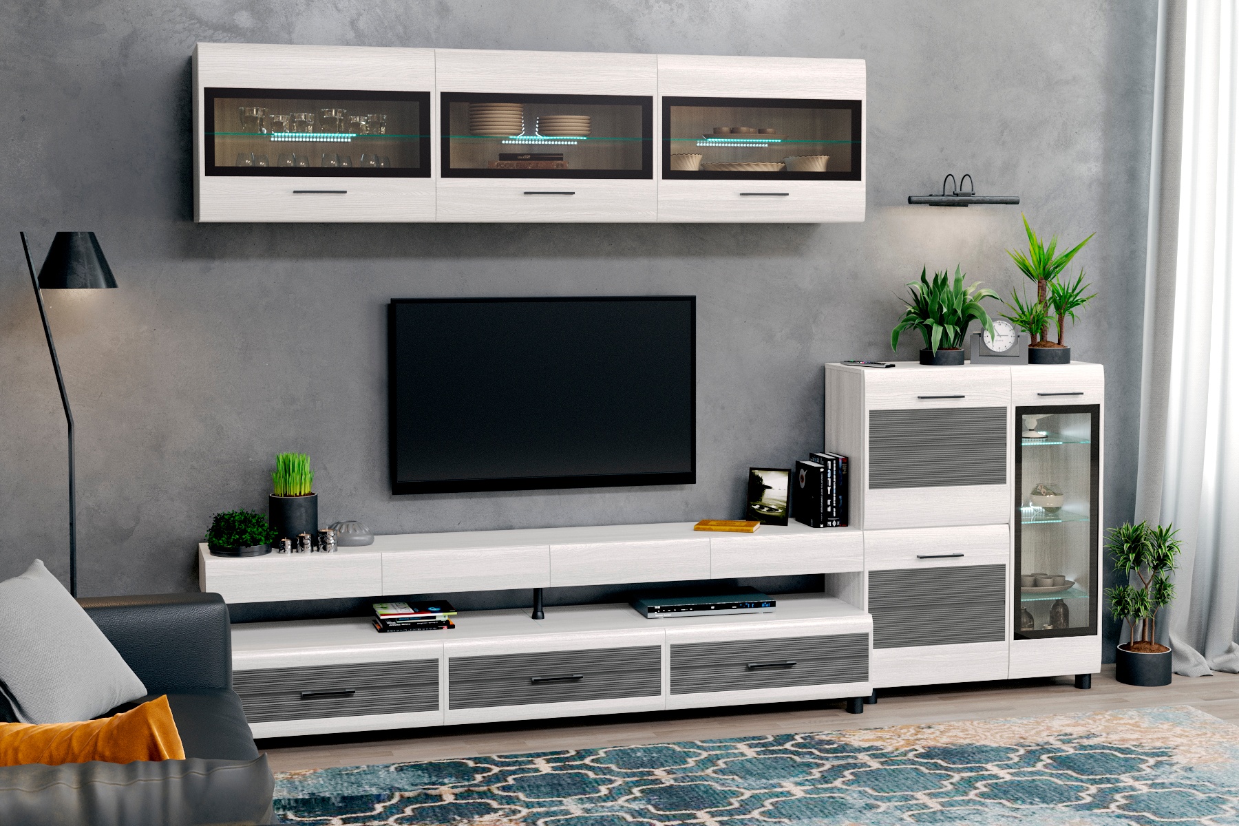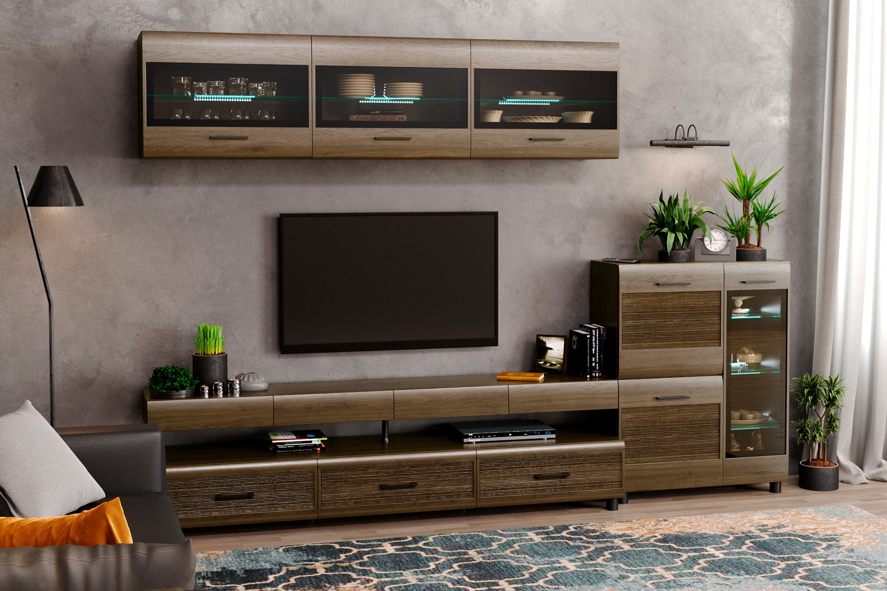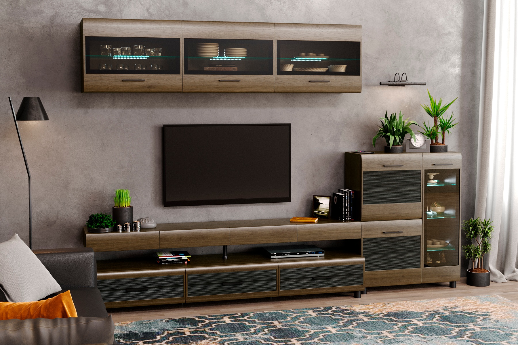 Корпусная мебель для гостиной "Камелия" - это модульная мебель. Фасады с комбинированными вставками имитируют специальную технологию "браширования". Мебель изготавливается из высококачественных материалов: ЛДСП, МДФ (фасад), стекло фасадов с оттенком "графит".
