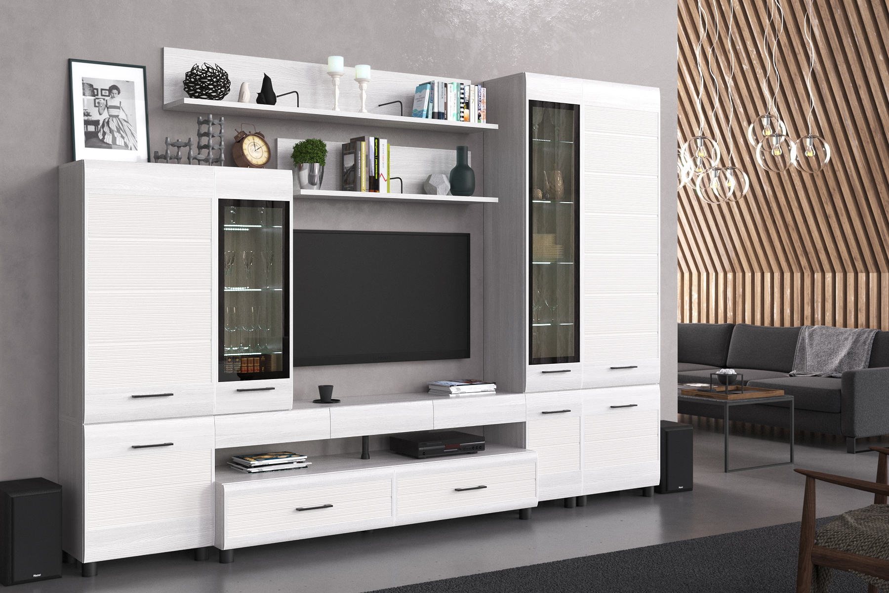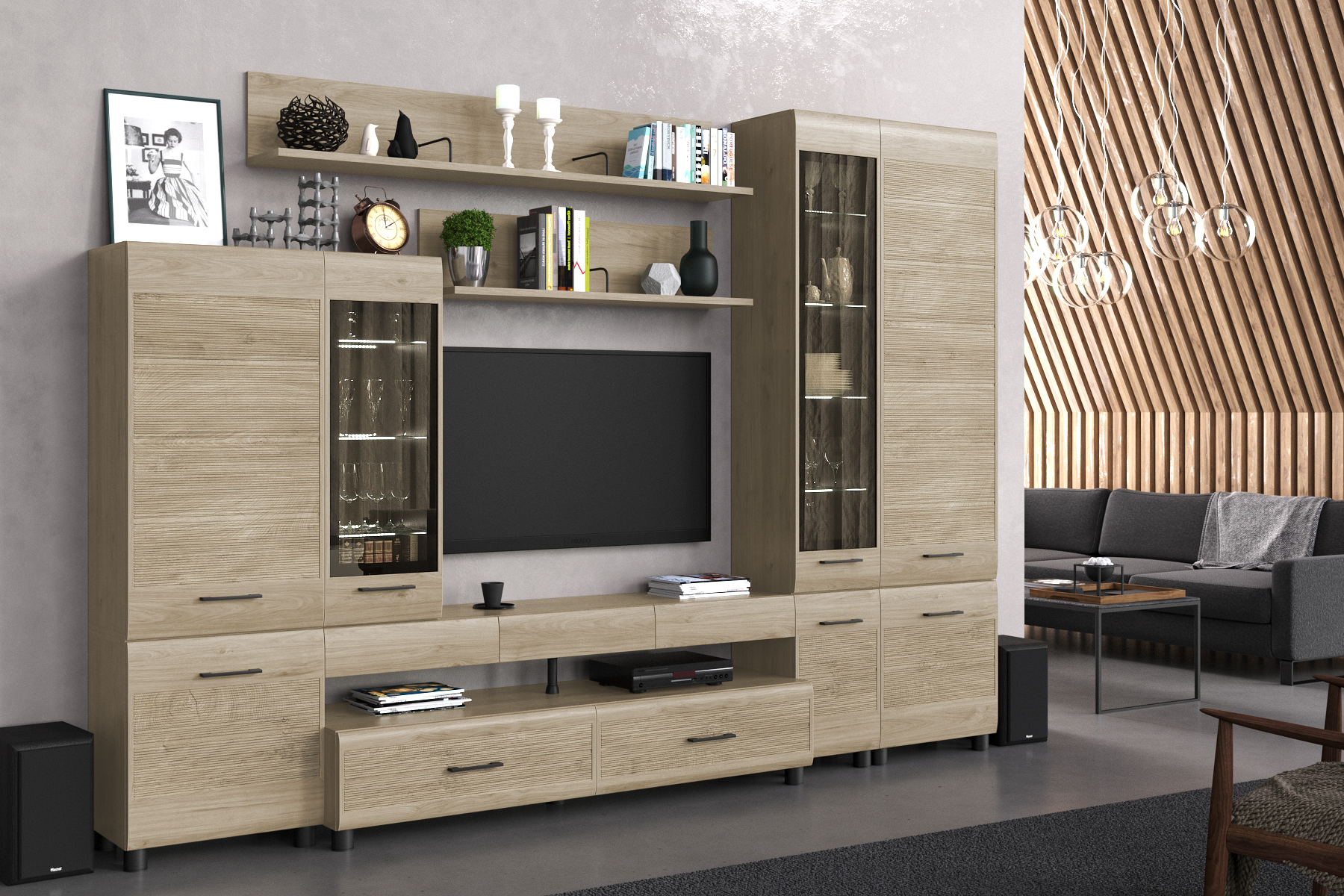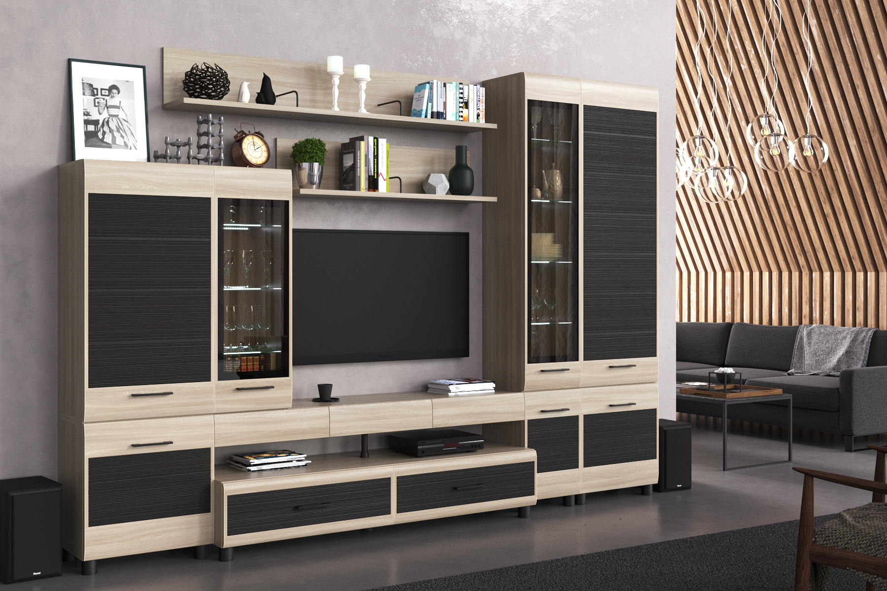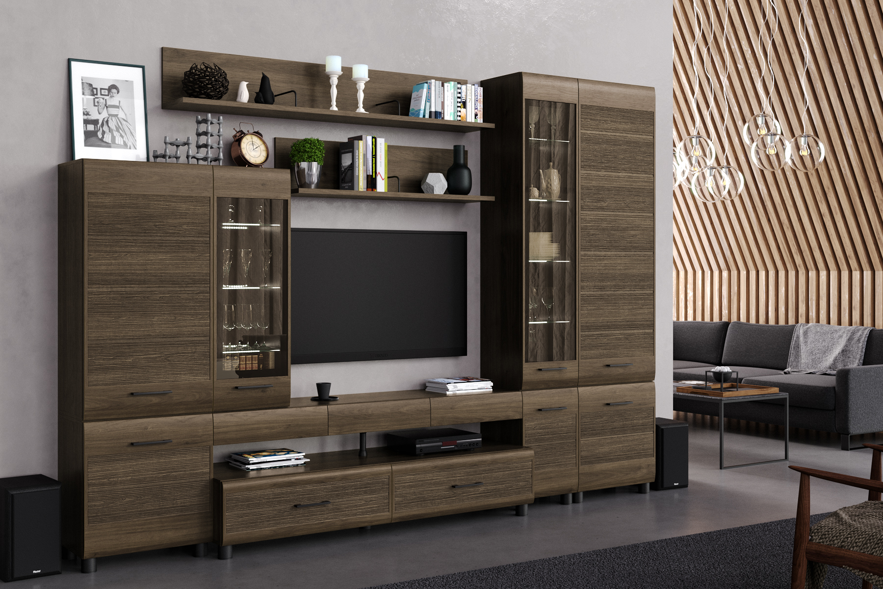 Корпусная мебель для гостиной "Камелия" - это модульная мебель. Фасады с комбинированными вставками имитируют специальную технологию "браширования". Мебель изготавливается из высококачественных материалов: ЛДСП, МДФ (фасад), стекло фасадов с оттенком "графит".