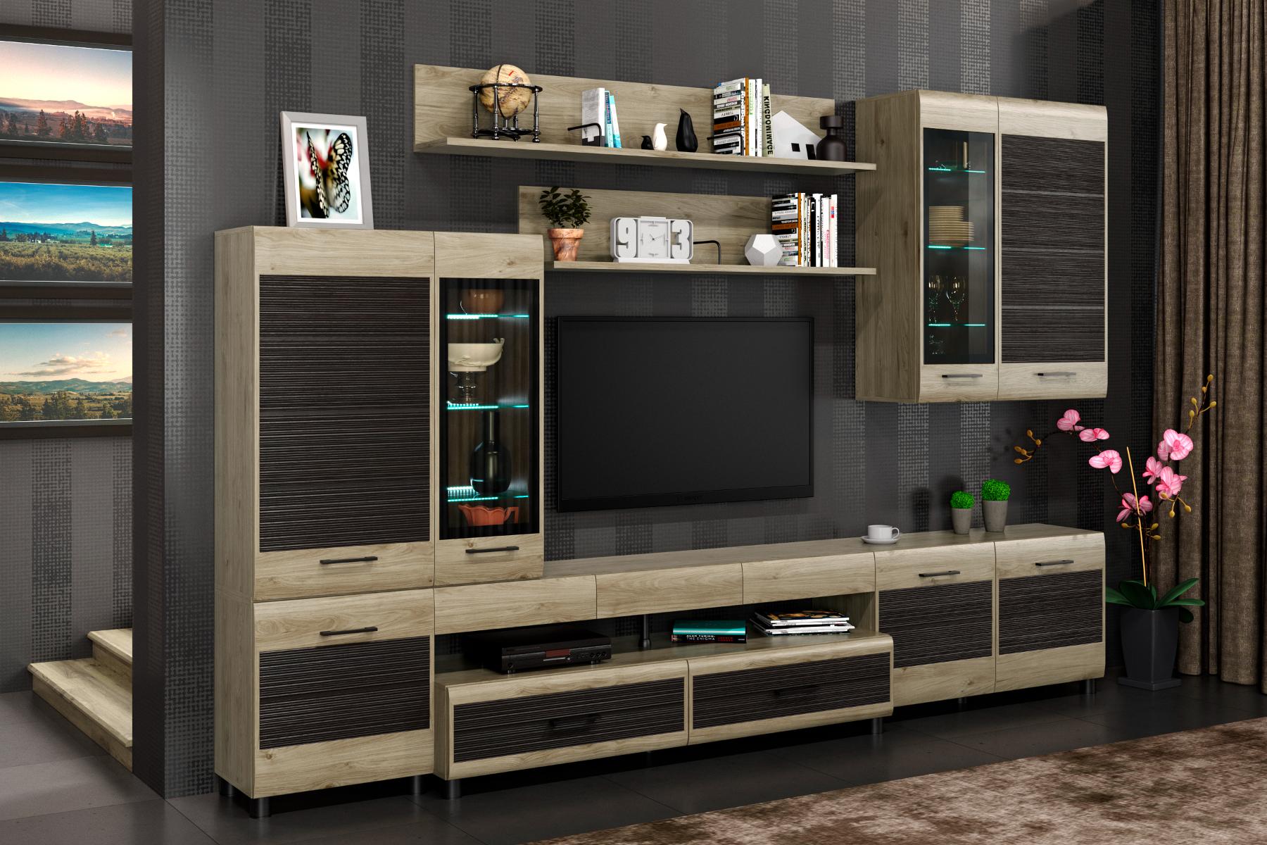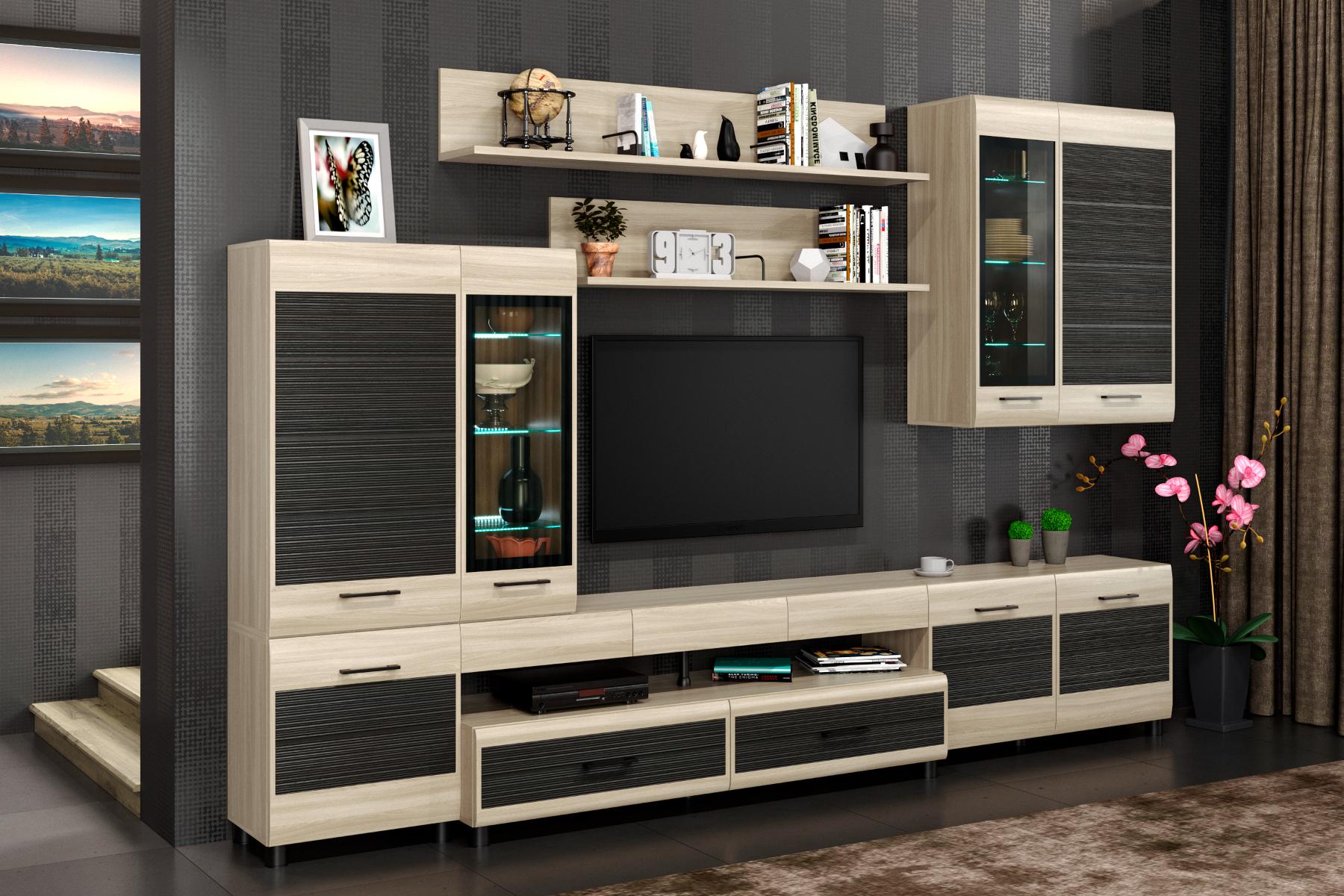 Корпусная мебель для гостиной "Камелия" - это модульная мебель. Фасады с комбинированными вставками имитируют специальную технологию "браширования". Мебель изготавливается из высококачественных материалов: ЛДСП, МДФ (фасад), стекло фасадов с оттенком "графит".