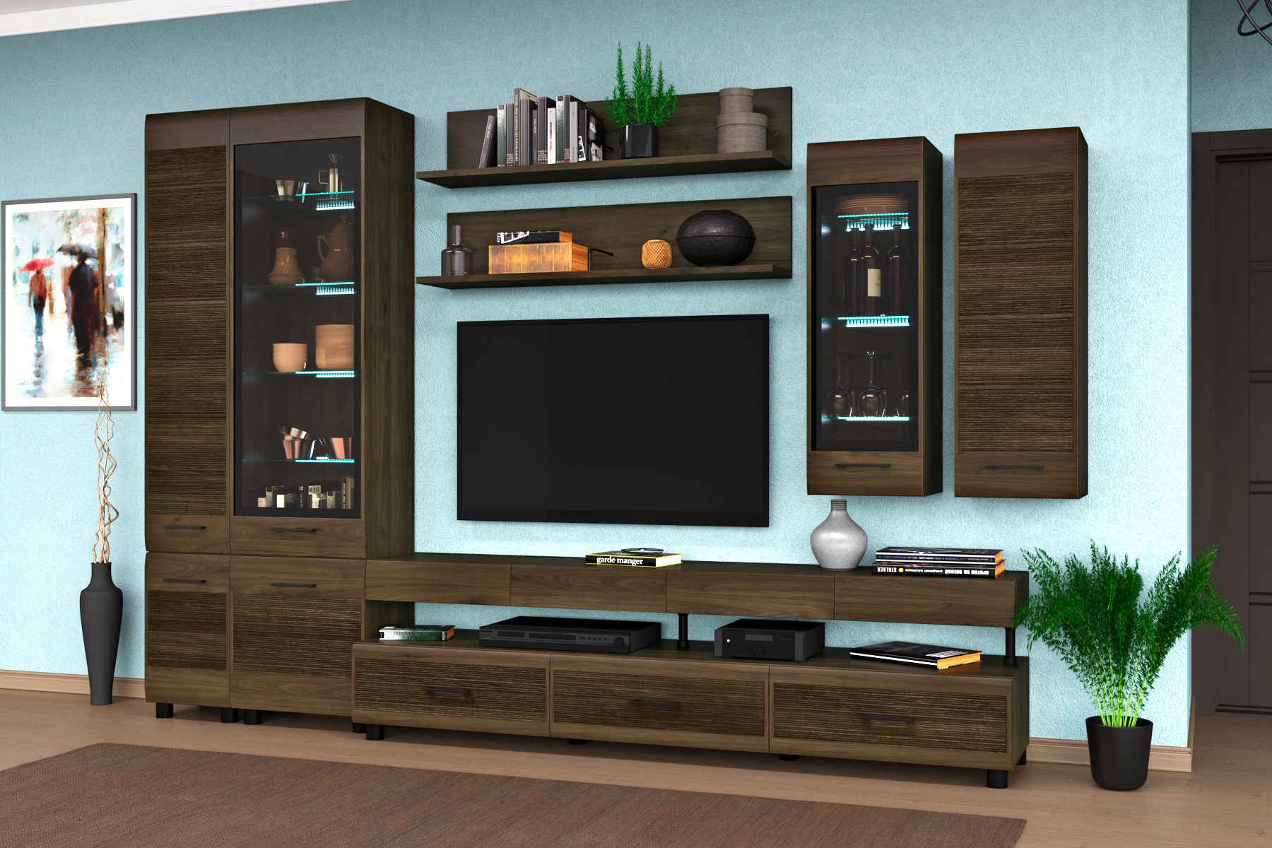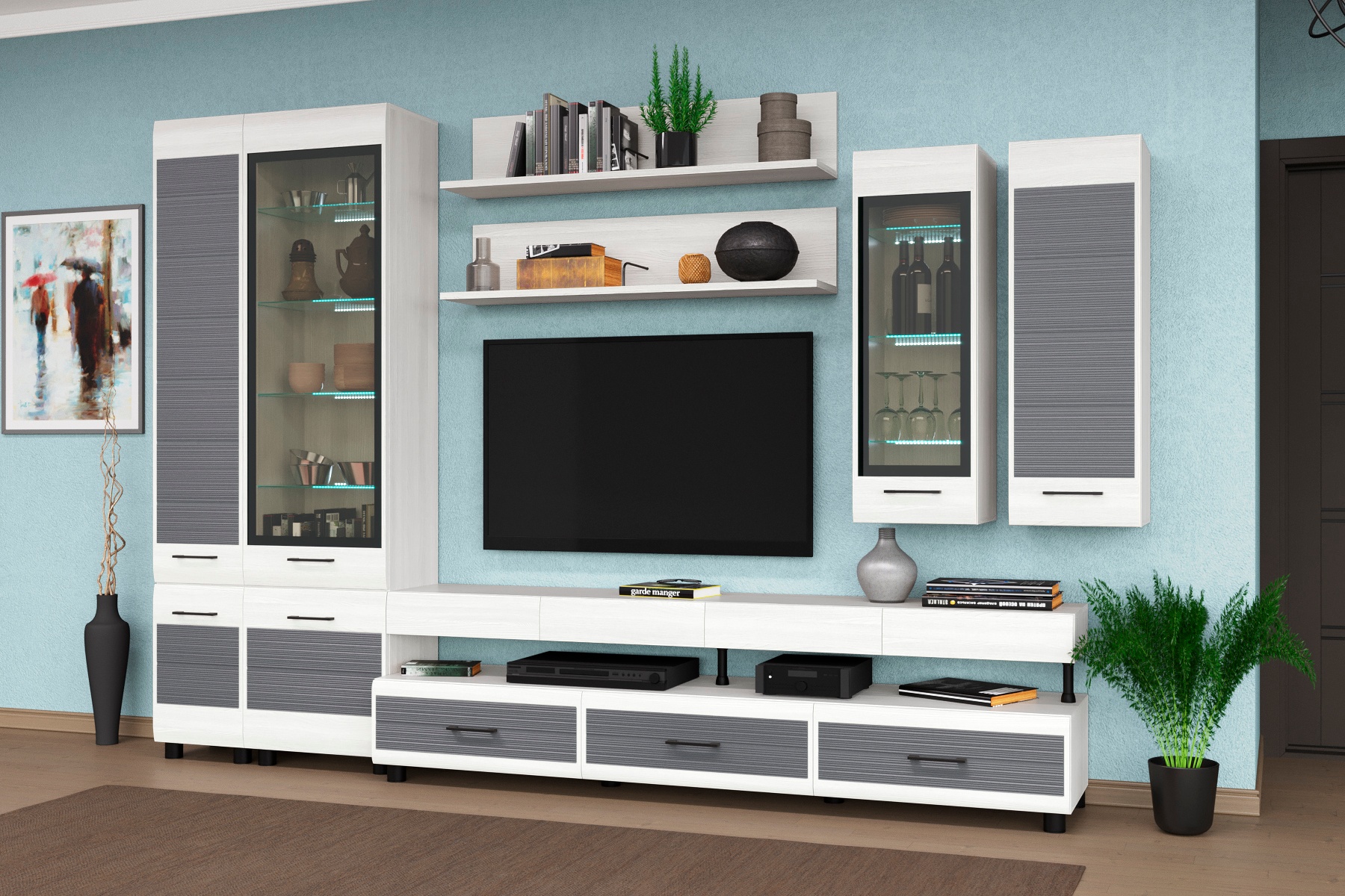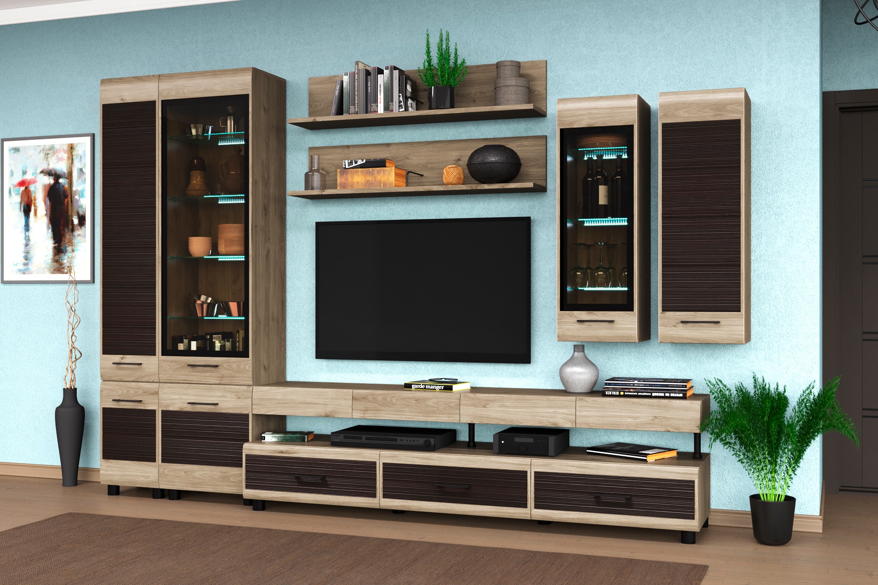 Корпусная мебель для гостиной "Камелия" - это модульная мебель. Фасады с комбинированными вставками имитируют специальную технологию "браширования". Мебель изготавливается из высококачественных материалов: ЛДСП, МДФ (фасад), стекло фасадов с оттенком "графит".