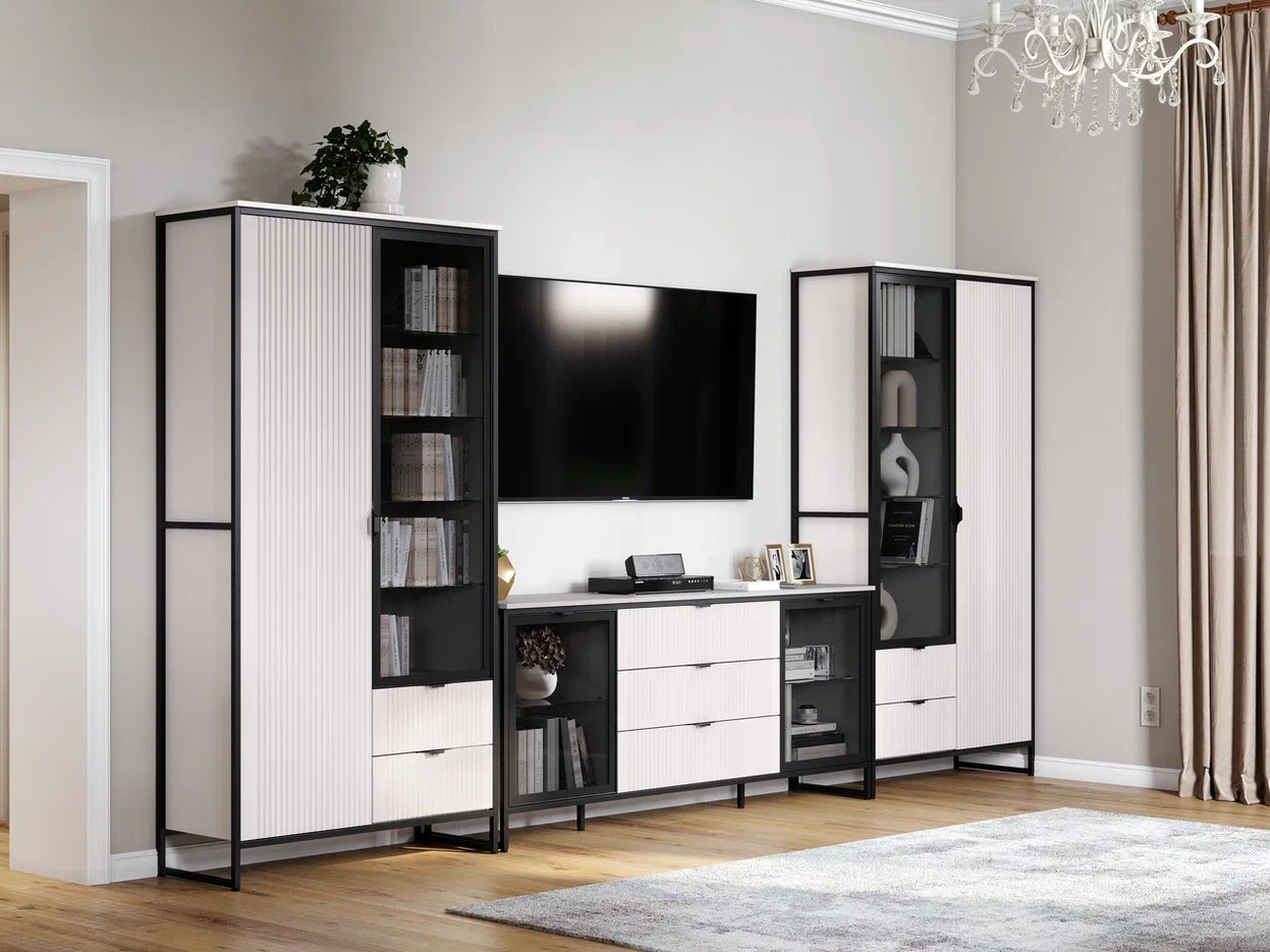 Черные ручки и металлокаркас по периметру фасадов – это те самые детали, которые создают эффектный контур мебели "Нора". Они не только подчеркивают изящество форм, но и придают гостиной глубину и выразительность. Этот контраст между классическими пропорциями и современными элементами создает уникальный баланс, который завораживает и притягивает взгляд.